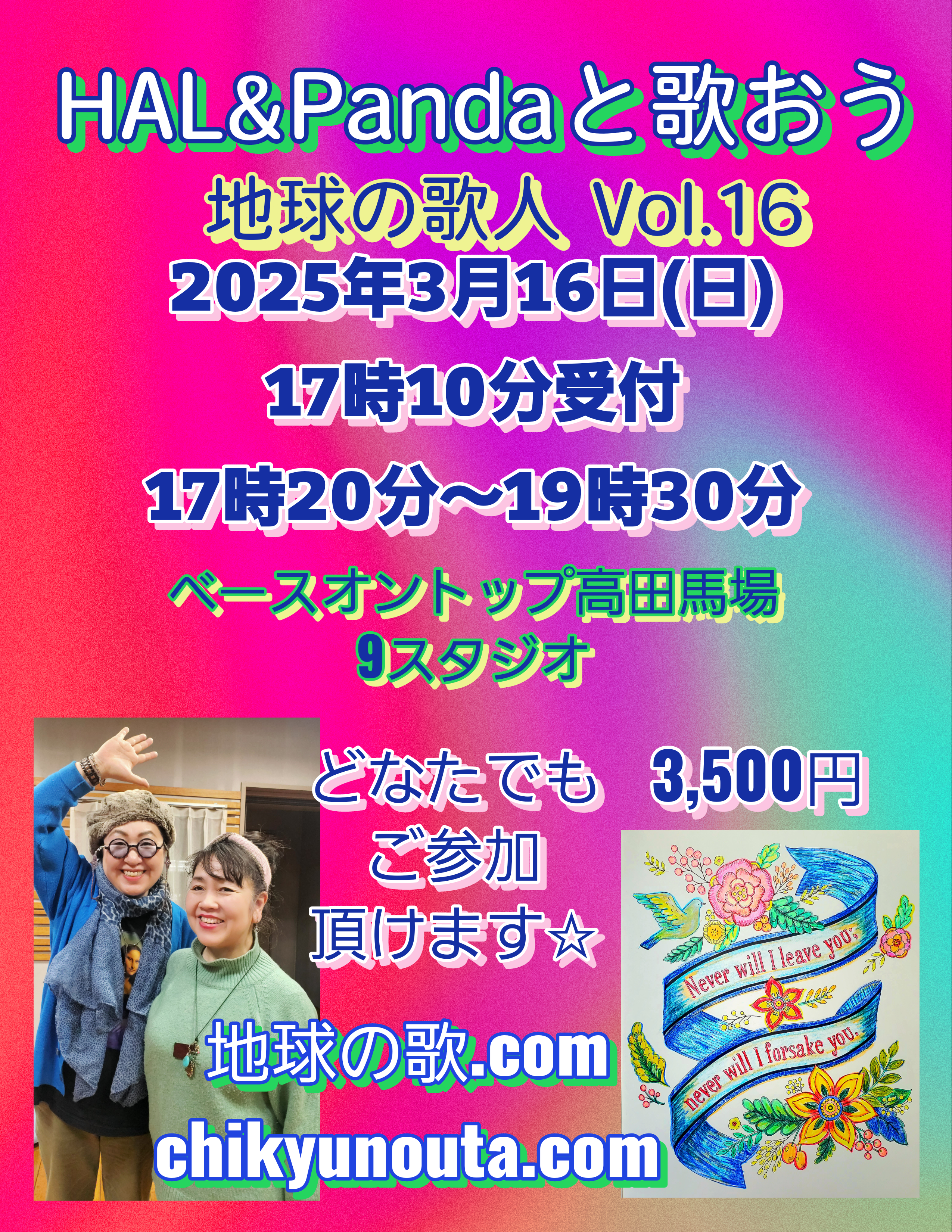 HAL&Pandaと歌おう❤️地球の歌人Vol.16 chikyunouta Okategoriserade 2025-01-292025-01-29 1 Minute ❤️HAL&Pandaと歌おう❤️ 地球の歌人 Vol.16 2025年3月16日(日) ♡17時10分受付 ♡17時20分~19時30分 3,500円 ベースオントップ高田馬場 9 スタジオ どなたでもご参加頂けます☆ 是非是非、一緒に歌いませんか☆ わっしょいわっしょい❤️❤️❤️ #HalandPandaと歌おう #地球の歌人 #HALANDPANDA クリックして印刷 (新しいウィンドウで開きます) 印刷 クリックして友達にメールでリンクを送信 (新しいウィンドウで開きます) メールアドレス Facebook で共有するにはクリックしてください (新しいウィンドウで開きます) Facebook クリックして X で共有 (新しいウィンドウで開きます) X クリックして LinkedIn で共有 (新しいウィンドウで開きます) LinkedIn クリックして Pinterest で共有 (新しいウィンドウで開きます) Pinterest クリックして WhatsApp で共有 (新しいウィンドウで開きます) WhatsApp いいね 読み込み中… 関連 公開済み 2025-01-292025-01-29